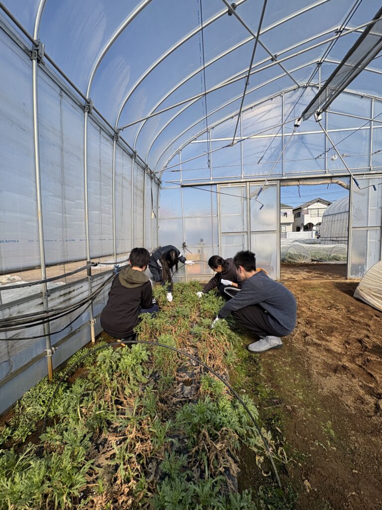 畑やビニールハウスでの作業を体験しながら、農家の方から仕事のお話を聞かせていただきました。土に触れ、作物の様子を見ながら作業をする中で、食べ物が育つ過程や農業の大変さ、やりがいを感じることができました。学校ではなかなか得られない、実際の現場での学びの時間となりました。